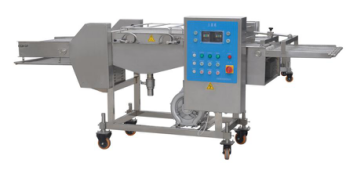 濃漿機是產(chǎn)品經(jīng)過上下輸送網(wǎng)帶夾持,在漿液中產(chǎn)品粘附面漿。通過風(fēng)刀時,多余的漿液被吹落。然后輸入到下一工序。產(chǎn)品適合于天婦羅產(chǎn)品。