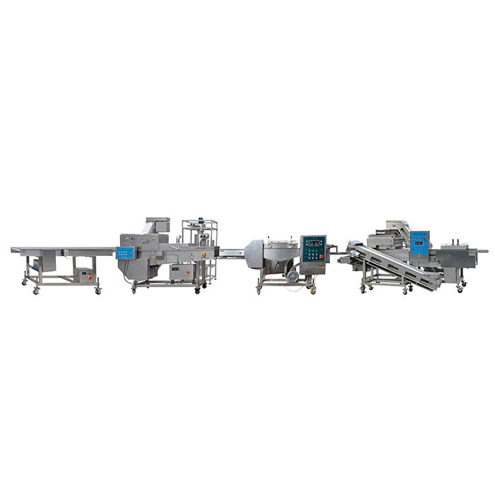 面包蝦生產(chǎn)線把蝦或者其他海產(chǎn)品經(jīng)上粉,上稠漿,上鮮康,油炸,速凍等工藝做出裹粉的炸雞腿。面包蝦生產(chǎn)線的需要配置前處理設(shè)備和后處理設(shè)備:油炸,包裝等設(shè)備,