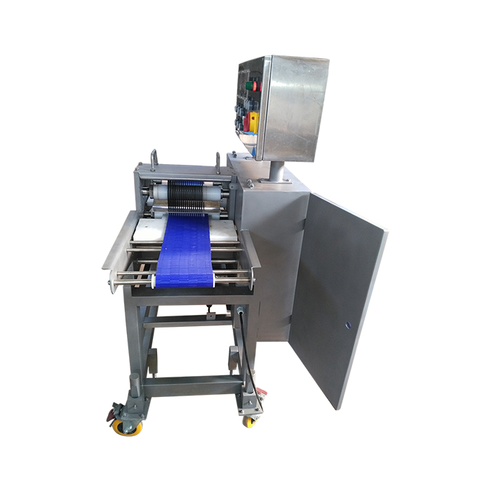 切條機是通過多組圓盤刀將肉均勻切割成條狀、塊狀等,適用于雞肉、豬肉、牛肉等其他畜、禽肉新鮮或冷凍原料的分切加工??膳c分切機對接成產(chǎn)出尺寸。
