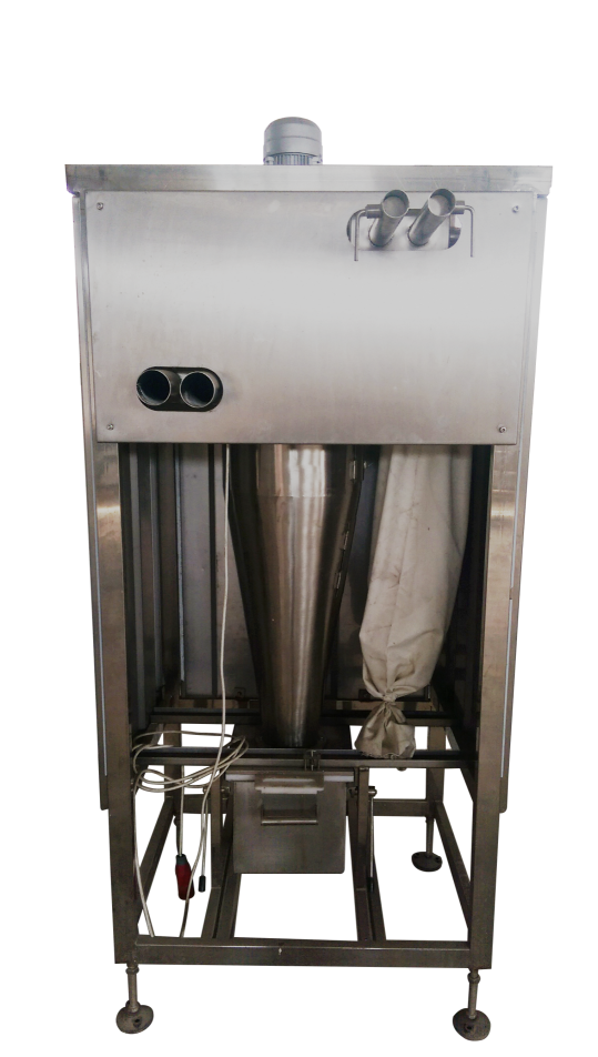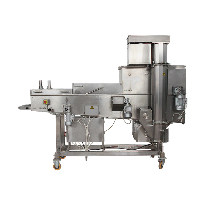 裹粉機能自動完成產(chǎn)品的預(yù)上粉過程,適用于各種預(yù)上粉、混合粉以及細面包糠到中等顆粒面包屑裹涂。產(chǎn)品進入下網(wǎng)帶,底部及側(cè)面沾滿粉,從上料斗流下的粉將產(chǎn)品上部覆蓋,經(jīng)壓輥壓緊(上下網(wǎng)帶上的粉厚度可以方便調(diào)節(jié)),上粉后經(jīng)過風(fēng)管,將多余的粉吹落。進入下一道程序。