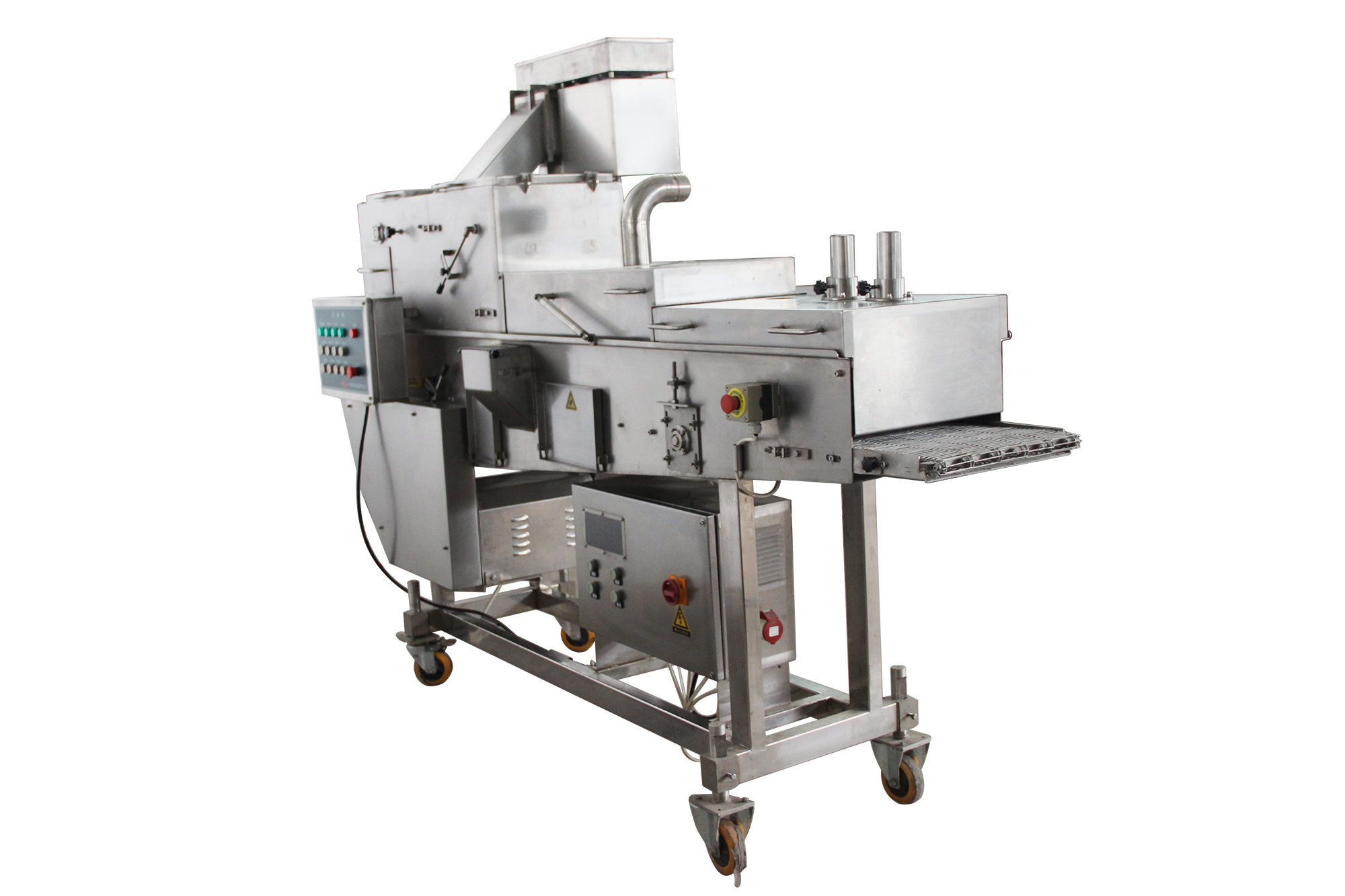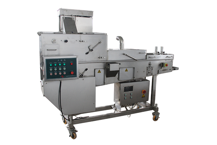 裹粉機能自動完成產(chǎn)品的上粉過程,適用于各種預上粉、混合粉等。產(chǎn)品進入下網(wǎng)帶,底部及側面沾滿粉,從上料斗流下的粉將產(chǎn)品上部覆蓋,經(jīng)壓輥壓緊(上下網(wǎng)帶上的粉厚度可以方便調節(jié)),上粉后經(jīng)過風管,將多余的粉吹落。進入下一道程序。產(chǎn)品通過傳送網(wǎng)帶時被均勻的裹涂上一層混合粉,以適應下道工序的要求,可以同上漿機、上面包屑機連接,組成不同產(chǎn)品的生產(chǎn)線。從而完成粉、漿、粉,漿、粉及漿、粉、粉工藝。