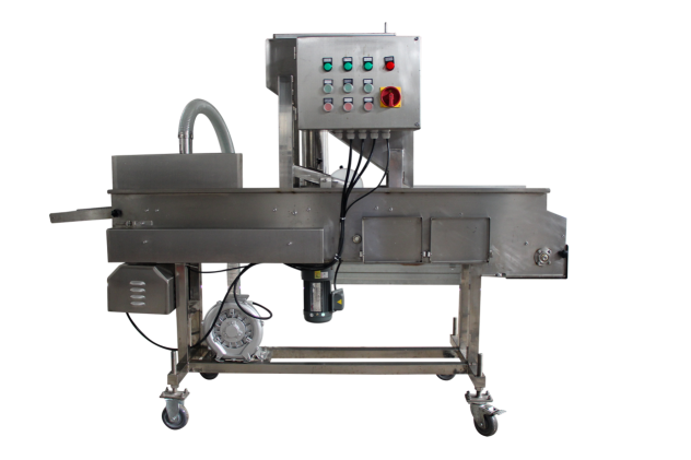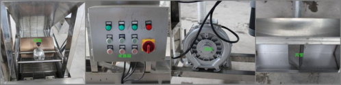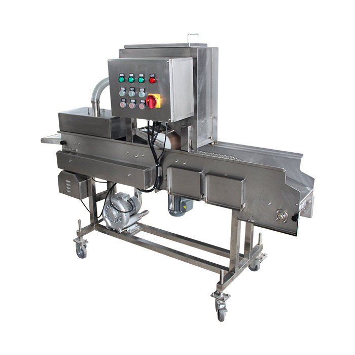 裹漿后產(chǎn)品進入下網(wǎng)帶,底部及側(cè)面沾滿面包屑,從上料斗流下的面包屑將產(chǎn)品上部覆蓋,經(jīng)壓輥壓緊(上下網(wǎng)帶上的面包屑厚度可以方便調(diào)節(jié)),上康后經(jīng)風機,將多余的面包屑吹落。進入下一道程序。
